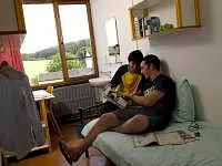 комната на 2 человек с удобствами в комнате, питание полный пансион. На территории школы есть WiFi.