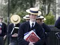 Есть у них и парадный костюм. Его надевают в конце недели, это сложившаяся веками традиция. Парадный наряд состоит из белоснежной рубашки, брюк в полоску, черного жилета, черного галстука, подтяжек, черного фрака и черного цилиндра. Если ученик является старостой, его костюм отличается от остальных учеников — они носят черный цилиндр и трость каждый день.